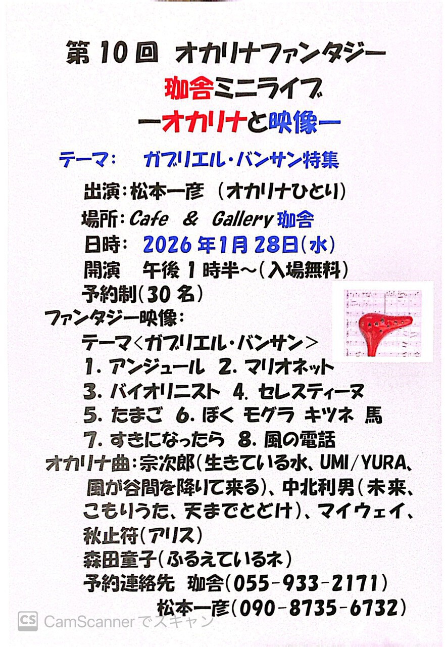今年、最後のオカリナファンタジーの開催のお知らせです♪